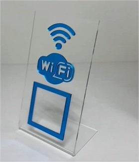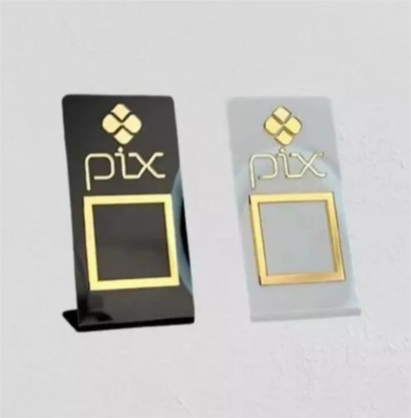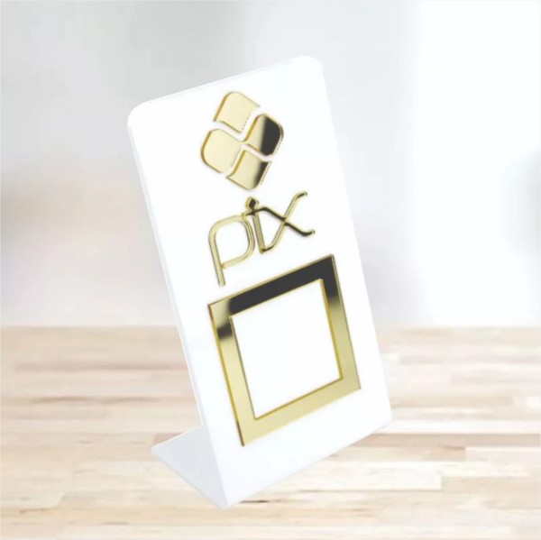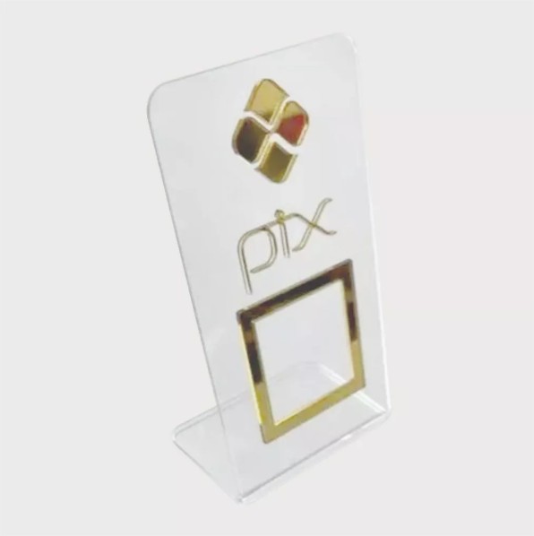 Plaquinha de Mesa display para pagamento QR code. Medida: 15 cm x 10 cm x 5 cm Acrílico transparente, preto e branco leitoso, com aplique em cores opcionais.