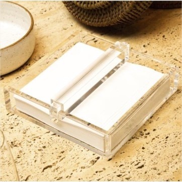 Porta-guardanapo de acrílico transparente com design elegante e moderno. Possui uma barra central que mantém os guardanapos organizados e facilita o uso. Ideal para complementar a decoração de mesas sofisticadas e funcionais.